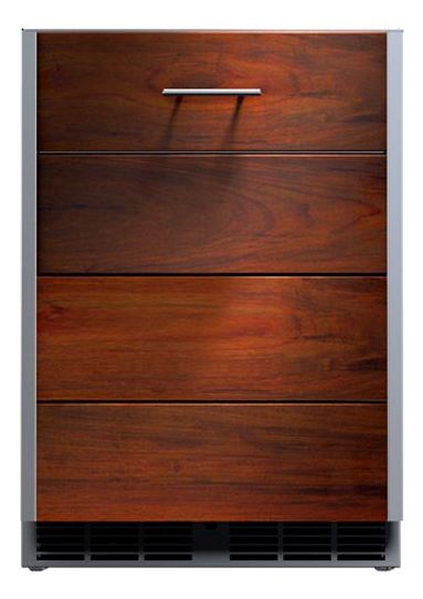 Arcadia Series: 24-inch wide, outdoor-rated, undercounter freezer with single door (right-hinged). Full-extension vinyl-coated shelves. Oiled Ipe wood overlay door. Marine-grade stainless steel. Martini glass chiller rack, appliance cabinets, and back panels available.Read More