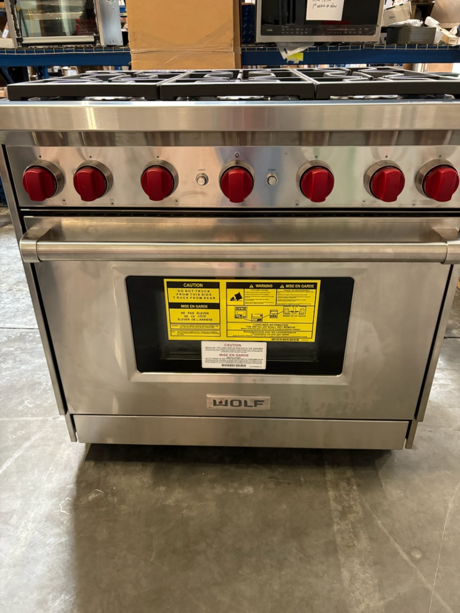 Wolf® 36" Stainless Steel Pro Style Gas Range with 5.5 cu. ft. total capacity, stylish red knobs and quality stainless finish. Serial ending in 6118Read More